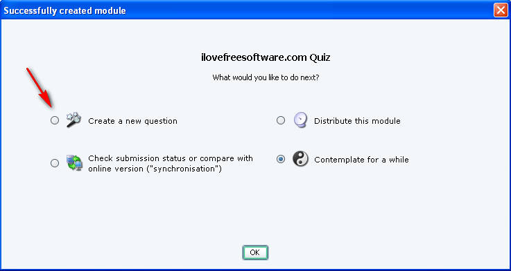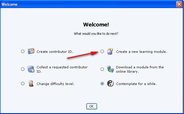 After selecting Create new learning module and then clicking OK, you will get another window where you need to name what the quiz or should I say module will be called and also determine what kind of background image will be used. After you click OK a few times, you will be presented with the following window: