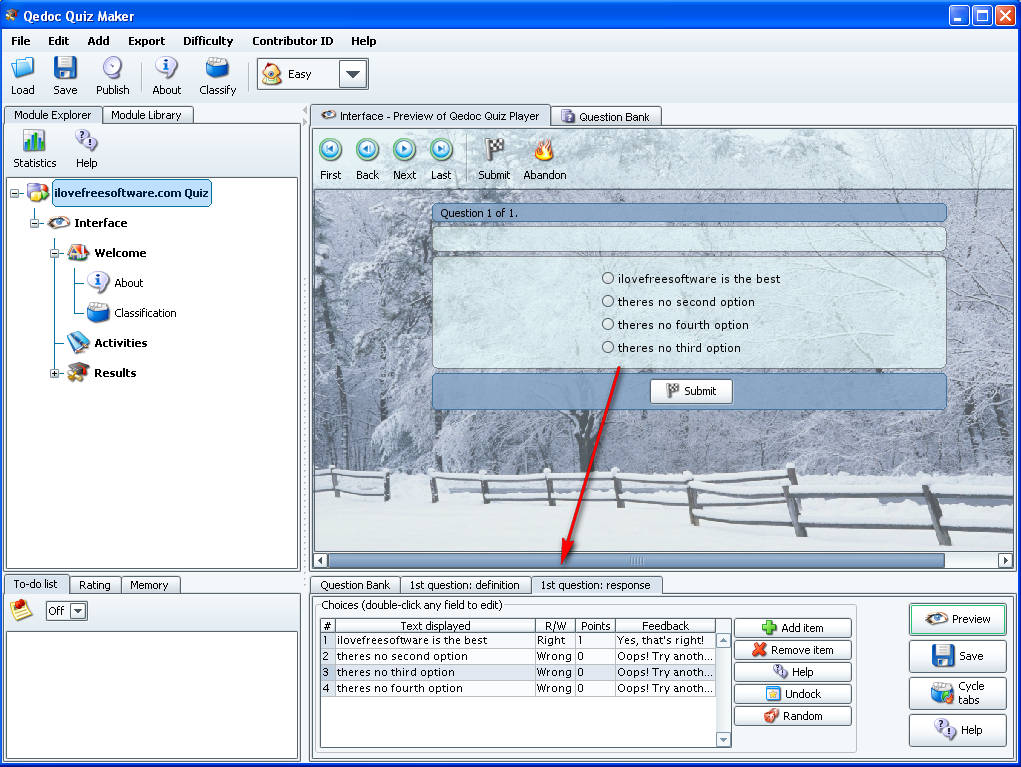 Down below where the arrow points, that’s where question can be edited. You can type in the answers and select which one of the answers is the correct one. Question should be typed in also, that’s kind of the most important part. Notice that on the image above we also have a preview of the question, that’s because if you download the Qedic Quiz Maker, Player comes bundled with it, so you don’t have to install it separately.