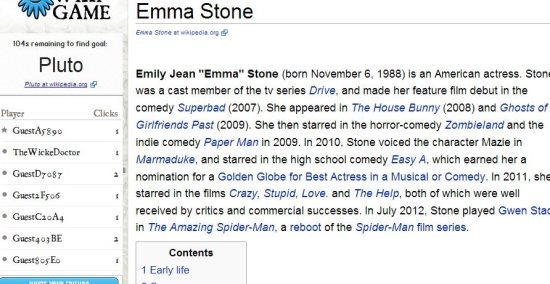 - Speed Race: In Speed race game, you have to navigate from one article to another in least time. In the main page, you are given two words and the second word can be opened in Wikipedia page for you to find the solution faster. Let’s look at an example (observe the below screenshot). The target word is Pluto and I was given Emma Stone (guess you are also wondering, how can such a beautiful actress Emma Stone be related to Pluto?). So, as you can see, there are words hyperlinked in the text (colored blue). My guess is that, you have to navigate through those links such that you might find a movie named Pluto. The most ironic thing is that, you will be shown a whole page of Wikipedia article and you have to search for related words and navigate through them. Reach your destination word within 2 minutes and score points. After two minutes are complete you will shown the winners and their clicks path. Instantly you will be given another set of words.