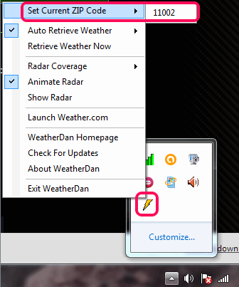 You can click its extension icon and it will show you weather report for default zip code. To change zip code, right-click the tray icon, and access Set Current ZIP Code option. Write the required zip code and press enter.