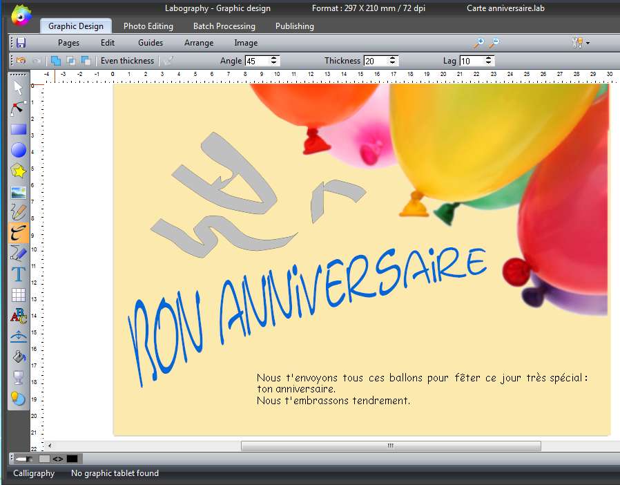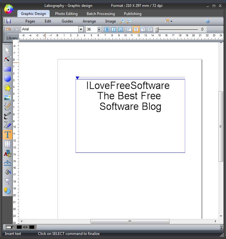 Labography is a free graphics editor which you can use in order to easily create fliers, posters, calendars or any other type of graphical documents and promotional materials. It comes with a large set of tools, step by step process where you go from graphics design, photo editing, batch processing and lastly publishing where you can set up printing or exporting to several common document formats.