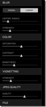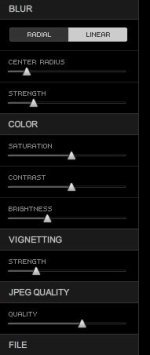 In the Blur option you can select between Radial and Linear mode, further you can adjust the centre radius and strength for an image.