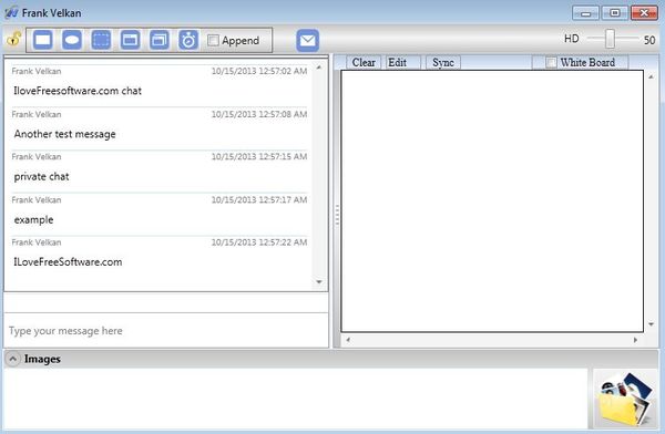 Doing that is gonna start up the chat window, where you can start typing messages, select images that you can to share (down below), use the whiteboard (white empty space on the right) and record your desktop using the tools in the top left corner of the interface.