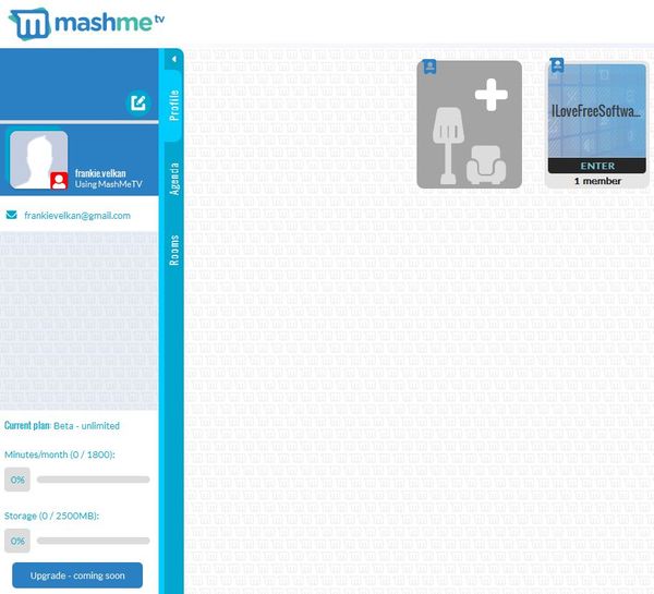 On the image down below you can see the MashMe dashboard, where you can manage your profile, schedule meetings and invite people to participate in them and also create chat rooms which give you even more functionality, like for example the ability to lock and password protect the chat room.