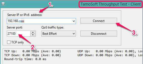 Step 3: On its client interface, enter the server IP address and server Port number. Keep the QoS (Quality of Service) traffic type to ‘Best Effort’. After this tap on Connect button. If configurations are correct, then both PCs will be connected. After this, it will immediately start sending and receiving the packets.