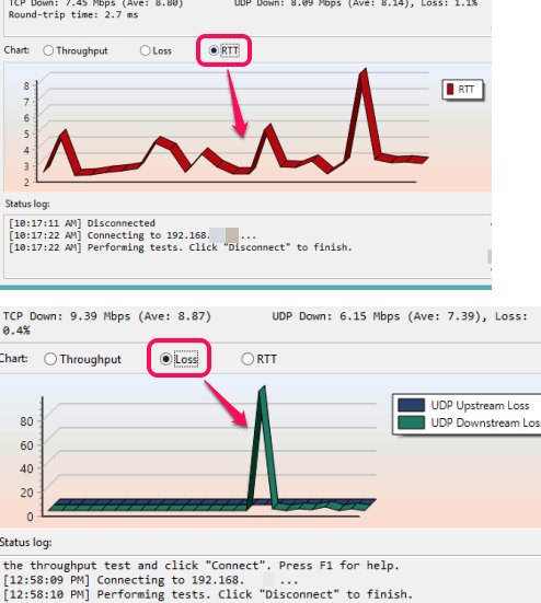 By default, it shows data for throughput only. However, you can switch to check packet loss and RTT data using the available radio buttons.