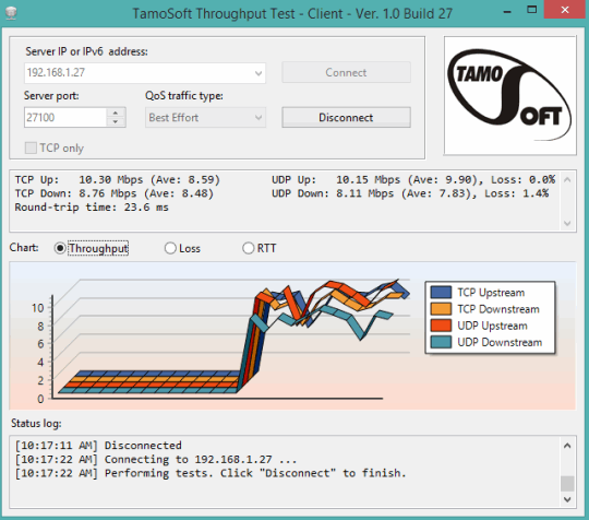 TamoSoft Throughput Test is a good software to test the performance of your wireless or wired network. It is easy to configure and generates results that may help to understand you how well or low your network is performing.
