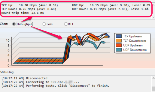 Step 4: Once the data transmission is started, it will start generating the results in real-time. You will be able to see TCP/UDP upstream and downstream values (current and average), packet loss in UDP, and round-trip time value. Just below these values, graph will also be visible to you.