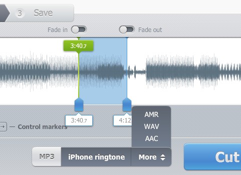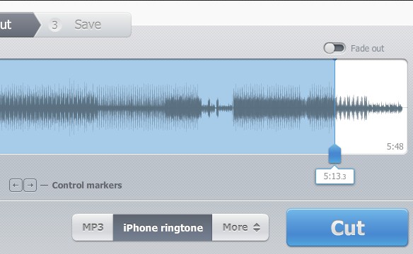 The two markers, first of which you could see on the first image above, and the second one on this one here are for setting the time frame that you’d like to cut out of a song. The other very important part of the setup is selecting the audio format that you’d like to use when saving the segment that you’ve cut out. MP3 and iPhone ringtone format are available for quick selection, with several others being available under the More drop down menu. Key features of Online Audio Cutter are: