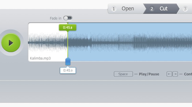 After selecting the song the you’d like to cut on the Open file step, which comes up right away, the second thing that you need to do, after the audio track get’s uploaded, is decide what part of it you’d like to cut.
