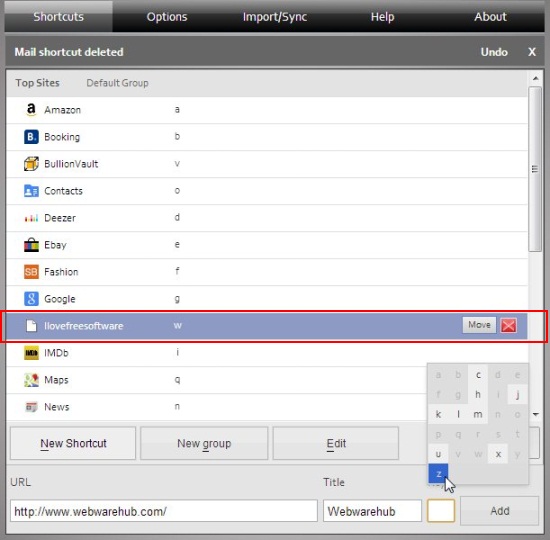 Under “Shortcuts” tab, there are options to Add New Shortcuts, Create New Groups, or Edit existing items. The highlighted portion shows the site which I have added to Site Launcher’s list by providing the site URL and choosing a key to be associated with it as shortcut (the Title is selected by default).