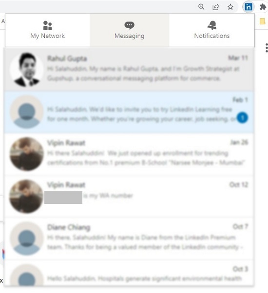 3. Observe that there are 3 tabs in the Extension window My Network for LinkedIn invitations, Messaging for LinkedIn messages and Notifications.