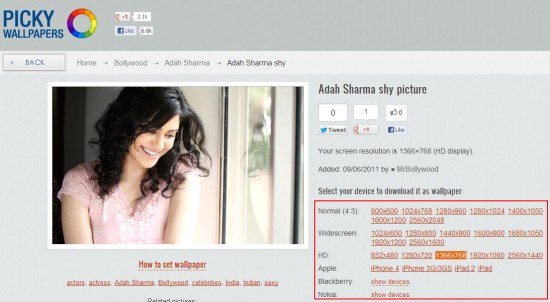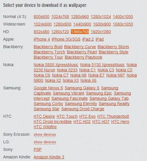 To download a particular wallpaper, you simply need to click on it. This will open the description page of that wallpaper where you will find links to download the wallpaper in different sizes or resolutions. And apart from that, you can directly pick the model of your mobile device from the listed ones and get the download of the wallpaper matching your device’s screen resolution, that too absolutely free!