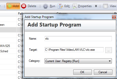 On its main interface, it will show all running applications that starts with Windows startup. You can select a program and can use Delete button to remove it permanently from startup list. Moreover, you can also add a new program to startup list using Add button. Provide name, source path, and category of the program that you want to add.