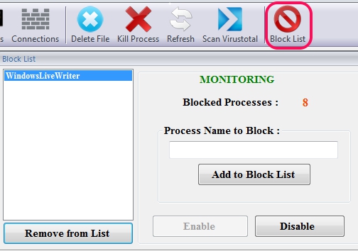 • You can add multiple processes to block list and those processes will not run until you remove them from blocked list. See the screenshot below: