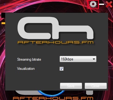 There are not many options present in this player. It is quite simple and basic desktop player for Afterhours.FM. As it is portable player, so you can open it directly. On its interface, it will start playing music and you can view the currently playing music of forum thread. At the top left side, there is a slider present to increase/decrease music volume. And on the top right corner of its interface, there is settings icon present which is useful to change the streaming bit rate or you can say audio quality. See the below screenshot: