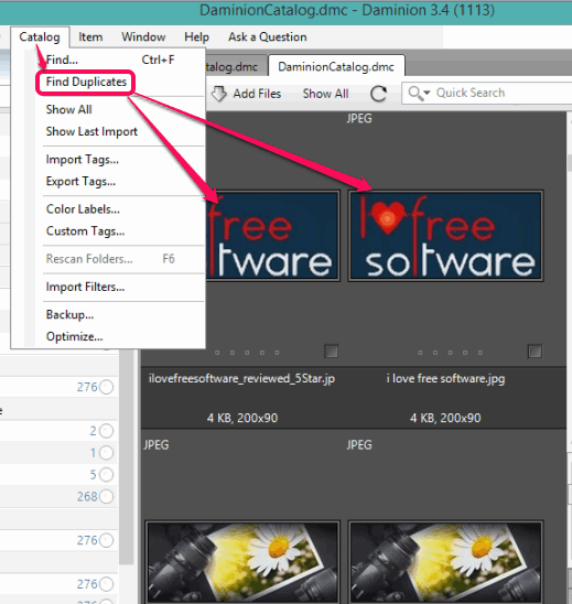 - Provides a feature to automatically find exact duplicate files present in your catalog. Just click on Find duplicates option present in Catalog menu and duplicated files are detected automatically. You can select those files and delete them using the context menu from your catalog. However, files are not deleted from original locations. You can use Locate in Explorer option from the context menu to jump to the original location and delete files.
