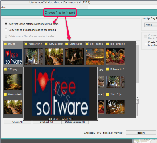 When you will open its interface for the first time, it will auto create a catalog with ‘DaminionCatalog.DMC’ name, and prompt you to import files in that catalog. You can either use that catalog or close it to create your own catalog. For each catalog that you will create, you need to add files or folder. Any type of file can be added to your catalog. While importing files to catalog, you can view thumbnails of files. Unwanted files can also be unchecked and those files will not be added to your catalog.
