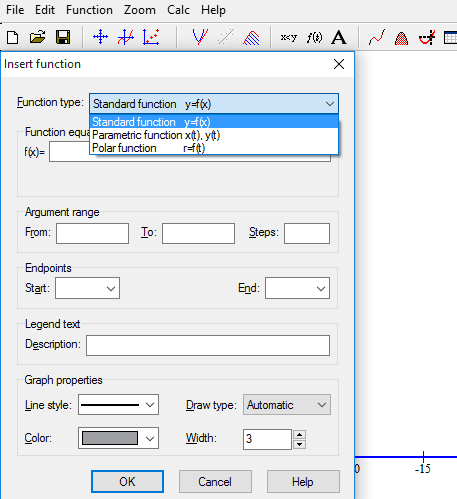 - Insert Function: This tool first lets you select from the pre defined function type and then enter the function equation. You also need to enter the range of the used variable. It also lets you customize important Graph properties.