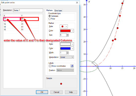 - Insert Point series: With this tool you can insert the respective value of both X and Y to plot their graph. You can also customize the physical properties of the coordinate marker.