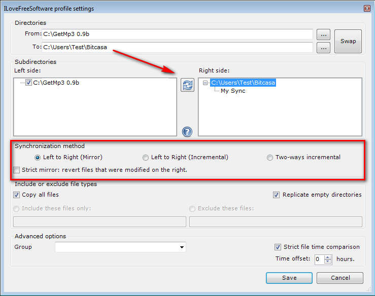 Open up the directories that you want to back up in the From and To fields that you can see on the image above, or down below in the Sub-directories portion of the window. Once you do that, and once you hit the Reload button which can be seen in between the left and right windows, the list of folders and subdirectories is going to be shown and thats it. Now you need to select what kind of upload you want.