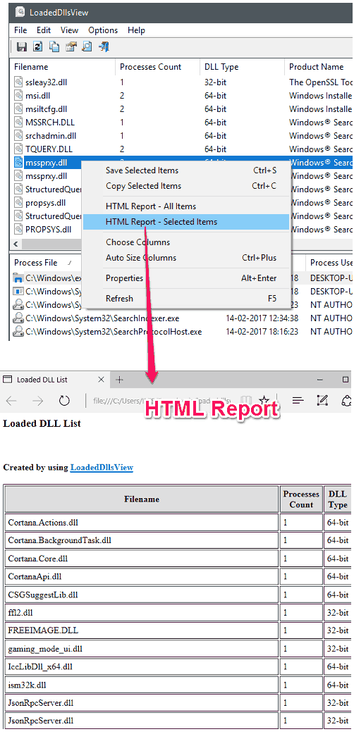 So, in this way, you can easily see DLLs of all running processes on your PC. After viewing the DLLs, you can also export the details to HTML file. The HTML file can contain the details of the single selected DLLs or you can also export the report of all the DLLS to the HTML and TXT file. To do this, simply select a process and from the context menu, choose HTML Report – All Items. After that, it will open up the browser of your PC and you can see the details of the files there.