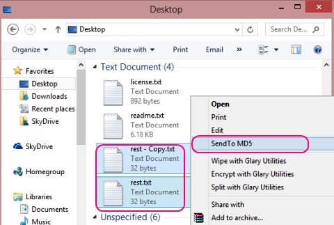 Another way of quickly generating MD5 hash value is select, drag, and drop files into SendTo MD5. Simply select the desired files and then drag-drop them in the SendTo MD5, or right-click on selected files and click on SendTo MD5. The freeware automatically generates the MD5 values. You can then click on Compare button to check the two MD5 values. This MD5 generator uses different colors to show the results.