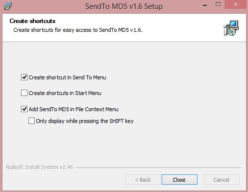 SendTo MD5 is a simple, fast, and easy MD5 hash generator. It’s size is very small and installation is easy. You can run it by going to the freeware’s folder inside the C drive. To make the freeware more useful, it gives you shortcuts to quickly run it and generate-compare files MD5 hash values. While installing, the freeware asks you for enabling these features by adding SendTo MD5 exe into the right-click context menu. Simply enable them.