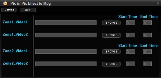 Pic In Pic Effect To MPEG Converter is quite easy to use. When you launch the app, you will see 4 “Browse” buttons listed at the top to select video files you want to create Picture In Picture Effect with. After browsing the files, you can set the starting and ending frames of each video to be included in the output (A video file is a combination of multiple frames (stills) joined together and played in sequence to produce motion).