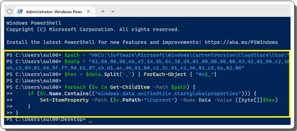 You just copy-paste the following PowerShell script snippet in the Terminal and hit enter. It will automatically set the desired Registry key with the correct value to enable the Settings app back in Start menu.
