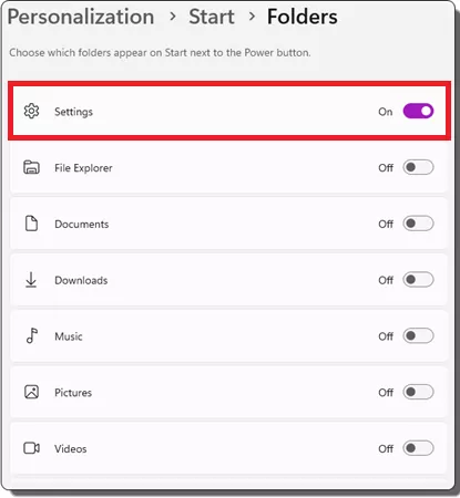 Now, go to the Folders section and then from here, enable the switch next to the Settings option. And that is it.
