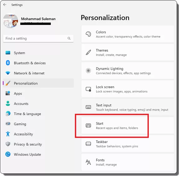 Open Windows Settings and then go to Personalization > Start.