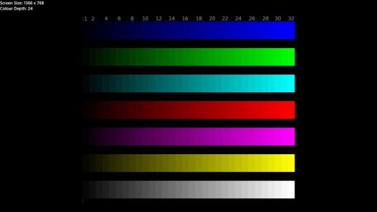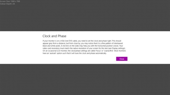 The last test, that is Clock & Phase, actually fills the screen with a pattern of interleaved black and white pixels. The screen will look grayed from far, but if you come close, you’ll be able to see the pattern. There’s one more option in the flyout, and that shows, the screen information: screen size and color depth.