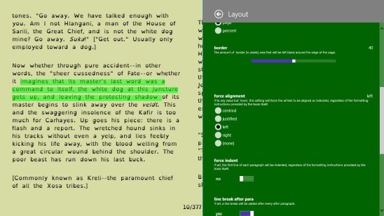 The app gives plenty of good options, that can help you to customize the reading screen and apply preferences, as to what, that will give you the best reading experience. Simply, open the Windows 8 Settings Charm, and you can change the alignments, borders, spacing, margins, paper style, indent, line break, para break, and lot more, using the four settings options in Windows 8 settings charm, which are: Text Appreance, Layout, Control, and Advanced. They are easy to use and are self-explanatory. Simply, use given sliders to change settings.
