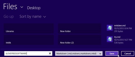 Once you are done writing your article, simply right click and click on Save. This saves the file in .md, .mdown, .markdown, .mkd formats. Another good thing about this Windows 8 markdown editor app is, all the opened files get listed in the far left of the screen, making it easy to toggle quickly between opened files.