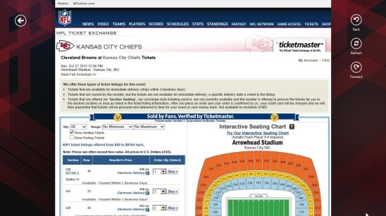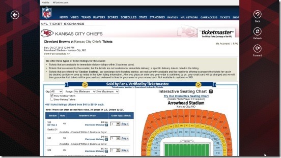 Also right click on any screen, brings up a flyout at the top. It contains: Home, News, Scores, Fantasy, Watch, Standings, Schedules, Shop, and Tickets. These all are toggle buttons, clicking on which opens respective screens. The News contains all news listed from the whole NFL and AFC. Scores lists down of all games week by week. Fantasy is where you can build up your fantasy team. You need to sign-in with NFL.com credentials for this. In Watch toggle, you can watch the videos from NFL Network, and NFL RedZone. In Standings you can actually see the current standings of teams in AFC and NFL by division, conference, and current league. These standings are on the basis of wins and losses, plus you can also see and compare the Win%, PF, PA, games win at home and on road etc. The shop and tickets, both are for shopping and buying NFL accessories like caps, players jerseys, etc. You’ll do shopping from official NFL Shop, and buy tickets of upcoming games from ticketmaster .