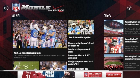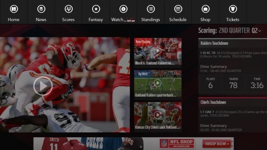 NFL Mobile, is a free Windows 8 NFL app. It is the official NFL app from NFL Enterprises. This is a Windows 8 app to bring all the latest and minute-to-minute NFL and AFC news right in your Windows 8 devices. You can watch videos related to NFL, highlights of the game, and videos from NFL Network and NFL RedZone. Plus you can also read different news stories on each player, team, play, and tournaments, view game scores, players stats in each game team standings according to Division and League, and shop for players jerseys and accessories, and buy tickets of upcoming matches. Not only that, you can also follow your favorite team, and know everything about the team, matches, schedules, players etc.
