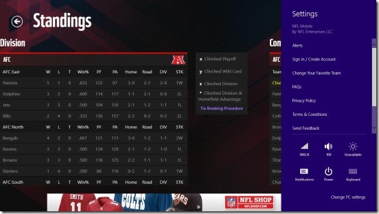 This Windows 8 NFL App is nicely integrated with Windows 8 Settings charm. It can be used to change favorite team, NFL alerts that you want to get, and Sign-in to NFL.com account etc.