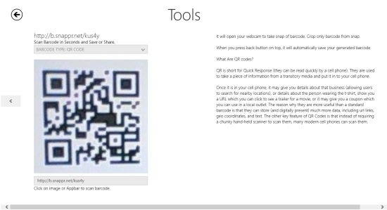 Barcoder is a Windows 8 QR Code Generator. As against the name, it is mainly used to generate QR codes for the textual data that you input in the app. There is also an option to scan QR Codes and you can get info about that QR Code.