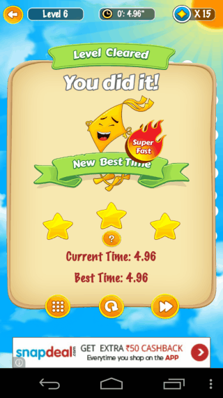 You have to complete each level in least possible time, for which you are awarded with stars accordingly. For any level, you can earn a maximum of 3 stars. If you are not able to clear any level, then you will lose one life.