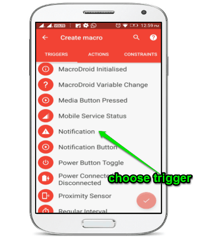 Step 2: To create a new Macro, simply tap on the “Add Macro” button and then it will ask you to choose a trigger and an action. On the “Triggers” tab, simply scroll down and select the “Notification” trigger. After that, a popup dialog will appear where you need to choose the “Notification Received” option.