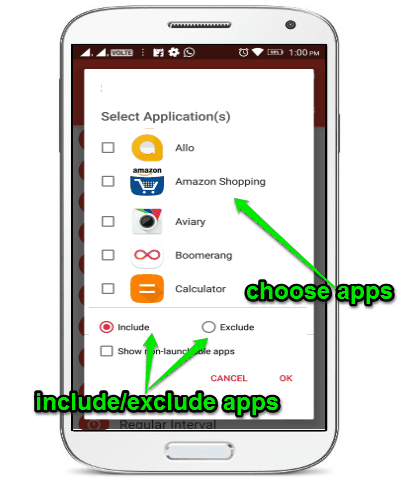 For example, let’s say you want to forward notifications from Facebook, Instagram, and WhatsApp to email, then select these apps from the list and then tap on the “Include” option. And if you don’t want to forward notifications of these apps, then chose the “Exclude” option.