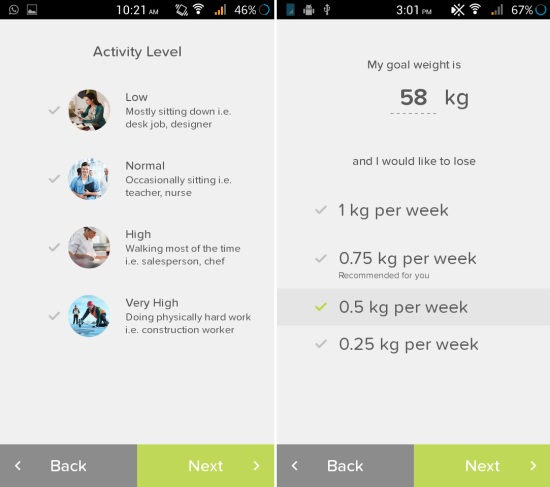 Now you will need to select the activity level and enter your goal weight. One thing I liked here is that the app warns you if your weight loss goals are unhealthy. This is helpful for people whose ideal weight might be unhealthy for their bodies.