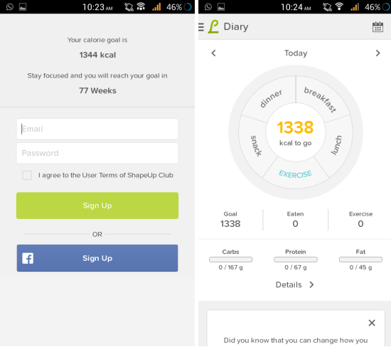 After you have entered the required data, app will provide you the option to sign up with email account or Facebook; use which ever sign up method you wish to use. After this, you will have the interface in front of you as seen here. The interface of the app provides a circle with number of calories in the middle. From here, you can enter what you had for breakfast, lunch, dinner, or as a snack. Also the Lifesum Calorie Counter for Android gives you the option to enter the exercises that you did, so that it can also account for the calories you burned by doing activities.