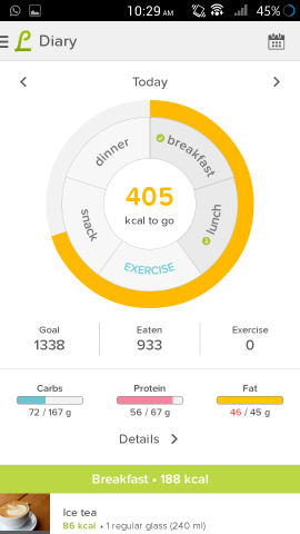In this manner you can build up the calories profiles of your day as seen below and also tapping on the details button gets you a more detailed view as shown here.
