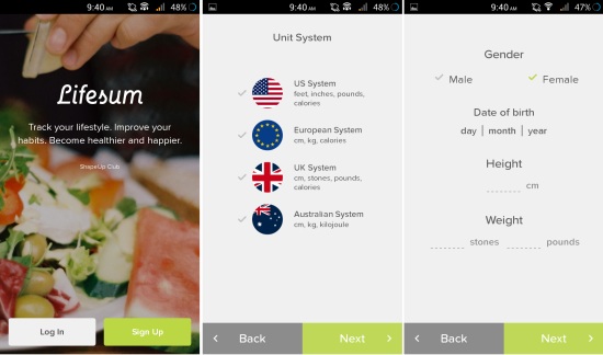 You can get Lifesum Calorie Counter from the link or QR code at the end of this review. After installation, launch the app and you will have the welcome interface in front of you. Simply tap on the ‘Sign Up’ option. Now the app will ask you to choose a unit system. Then you will be to fill some basic information about yourself, as seen here.