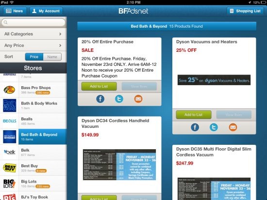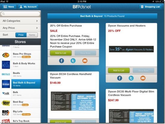 BFAds.net is a free iPad app that provides Black Friday offers from popular retailers. This iPad app only works in landscape mode containing all the best deals for Black Friday. You can browse deals and offers according to different stores. Just browse between different stores, compare the prices and products and get the best deal on the product which you want to purchase on this Black Friday. The app also allows you to browse deals according to different categories which include apparel, appliances, arts & crafts, automobile, baby, books, cellphones, desktops, digital camera, digital media, and much more. You can even sort the deals according to the price and name of the products.