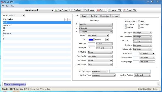 The program interface consists of 2 separate panels; the left panel displays a list of all the added CSS elements, and the right panel shows various tabs to modify element properties category-wise. These categories includes text properties, display properties, border properties, dimensions, and source code. Simple CSS also support CSS2.