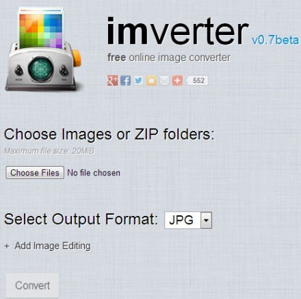 Imverter is a free online image converter service. The formats supported by this service are JPG, PNG, PDF, TIFF, GIF, EPS, PSD, BMP, FAX, PCX, PGM, PICT, PPM and TGA. This service does not require any sign up. Apart from converting of images, it also rotates images, resize images, add border and also turn images into black and white mode. It also provides the facility to upload a zip file and convert bulk images in a go. You can thereafter save the image also in your PC. It will come handy as it has nice features and also works fast.