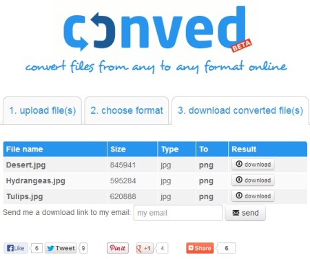 Conved is a free online image converter service. It supports formats like JPG, GIF, PNG and BMP. It is very easy to use. It converts images in batch, and the output is delivered quickly. It is a three step process. First, choose the files you want to convert by clicking on the Upload file option. Once the files are uploaded, you will require to choose the format which you want the image to be converted into. Then just click on the Convert option. The screenshot above shows the converted images, you can then click on the download option. The converted image will be downloaded in your PC. Other than that you have the option to get the download link by providing your Email id. Once you do that, you can embed the link anywhere. However, this online service does not have options to edit the image in any form, you can only convert it.